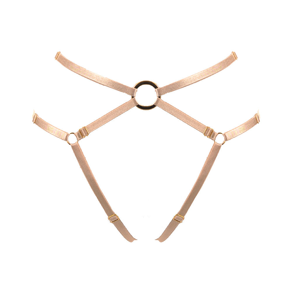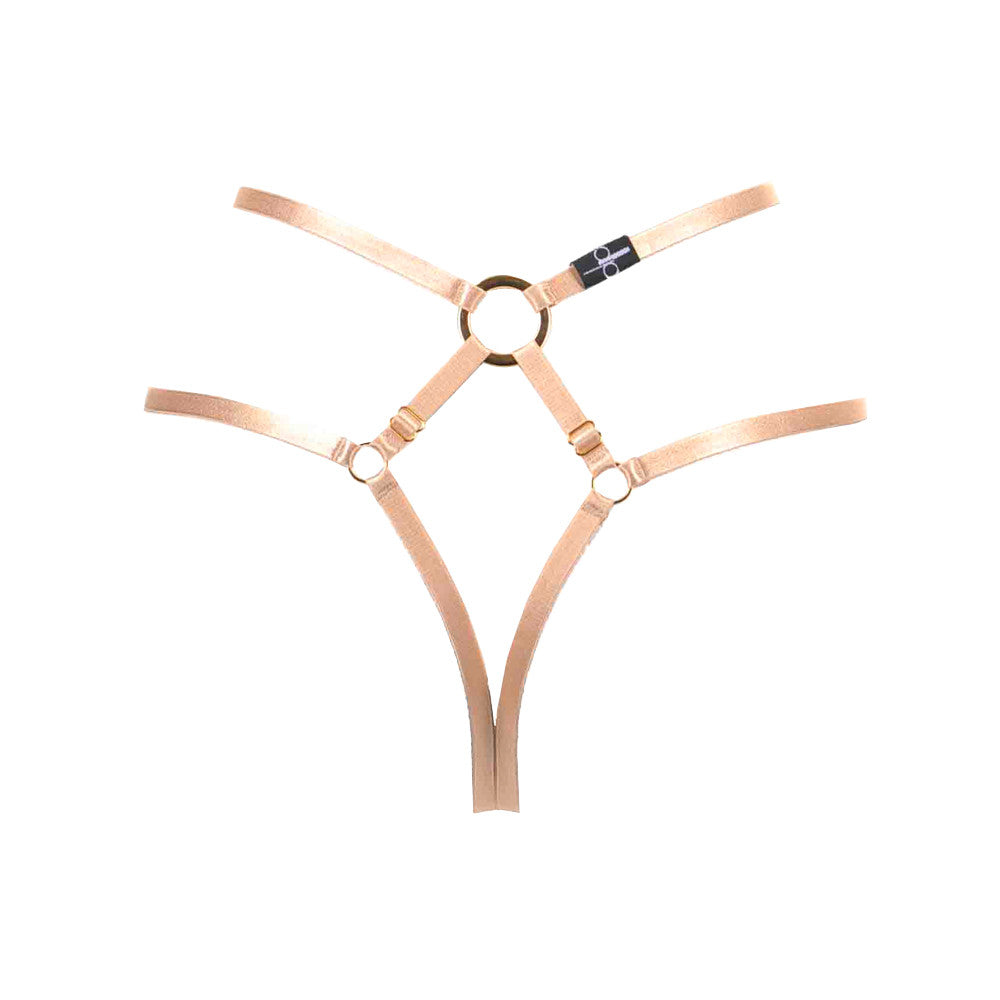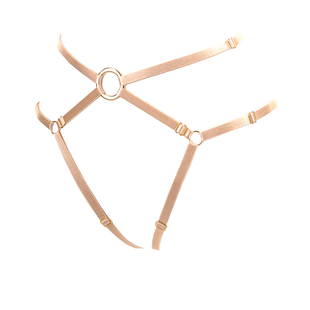 The Bon Bondage harness thong slim is like the classic Bon Bondage harness thong, but with 10mm satin elastics. Crafted from soft, Austrian satin elastics that are held into place with nickel free, gold plated rings and sliders, the Bon Bondage harness thong slim is the perfect accessory to take your lingerie from day to night. Adjusters sit on every single elastic for easy access and adjustment and fits all sizes from XS-XL.