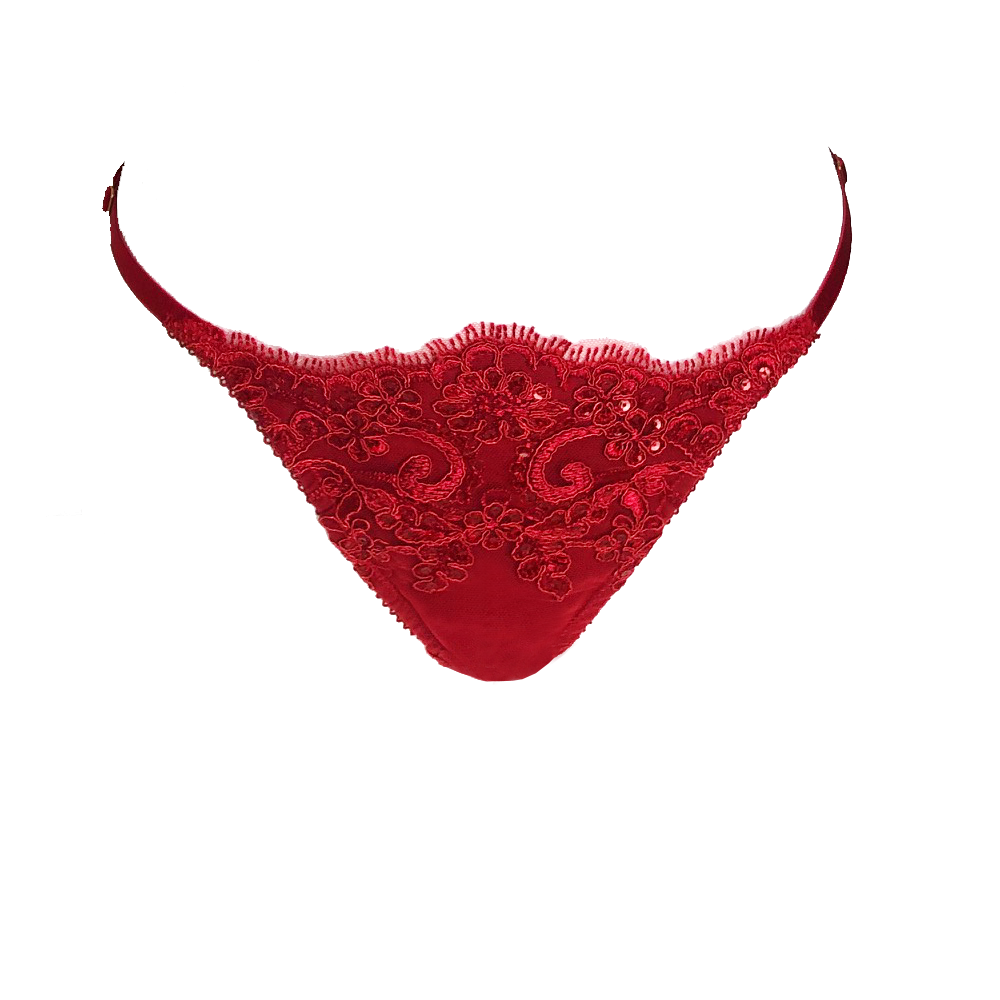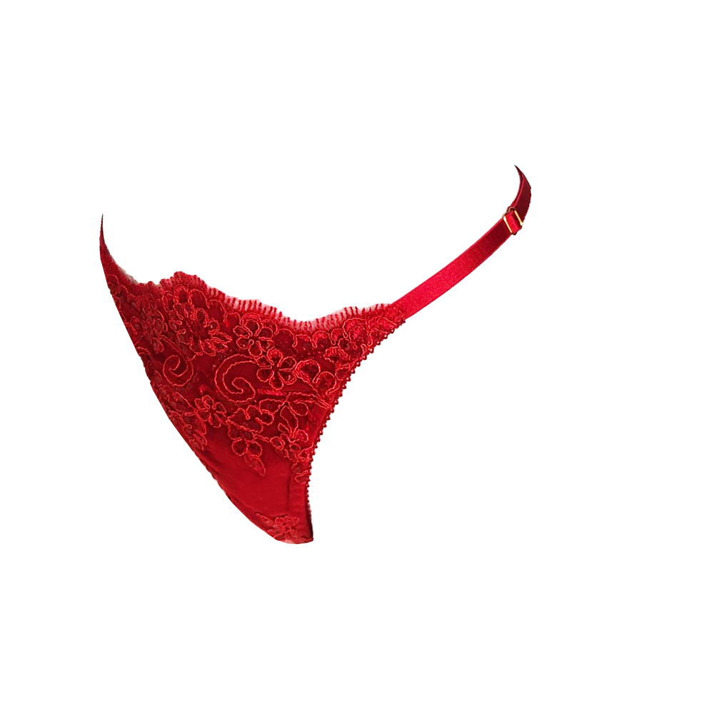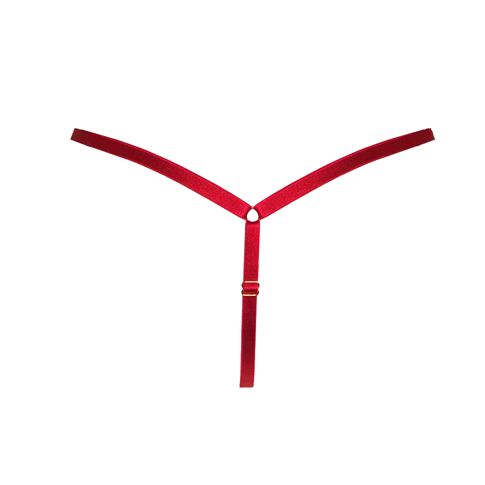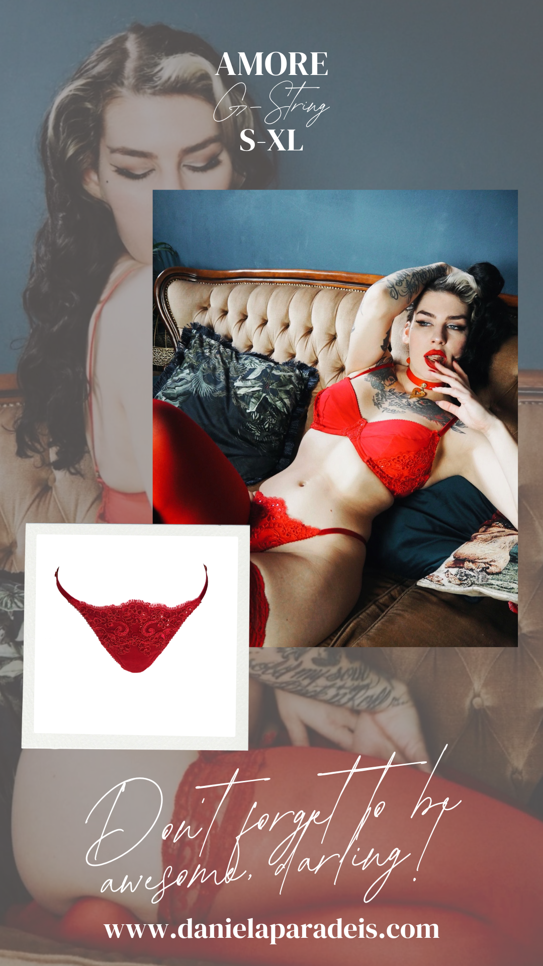 It's an itsy bitsy, teeny weeny, delicate little thong made of fine embroidered mesh and shiny satin elastics (and a super soft lining). The Amore G-string is super adjustable in the waist and the back with gold plated rings and sliders and just that airy bit of romantic sexiness you need.