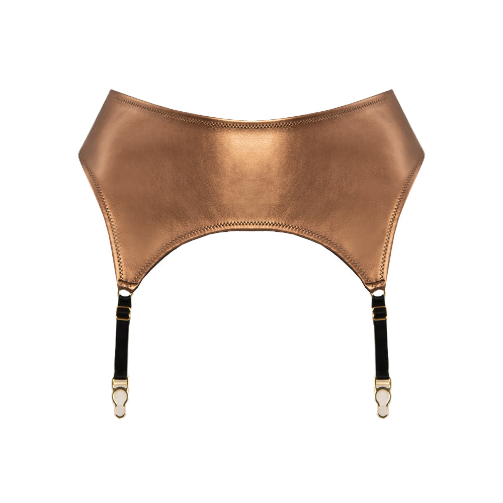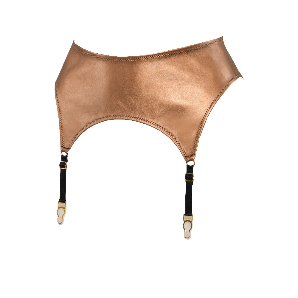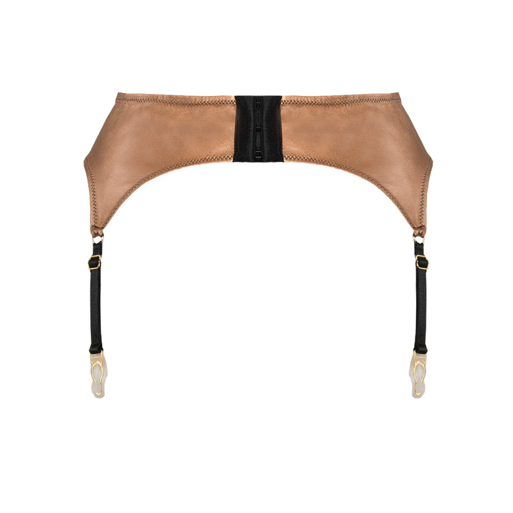 The Bon Bondage Doré suspender belt hugs your curves in the fanciest gold, whether you prefer to wear it slung low around your hips or at your natural waist. Handcrafted from vegan leather, the suspender belt is fastened with a traditional, black hook & eye in the centre back. Adjustable, black satin elastics make this the perfect addition to your favorite stockings and is the ideal gift for lingerie lovers.