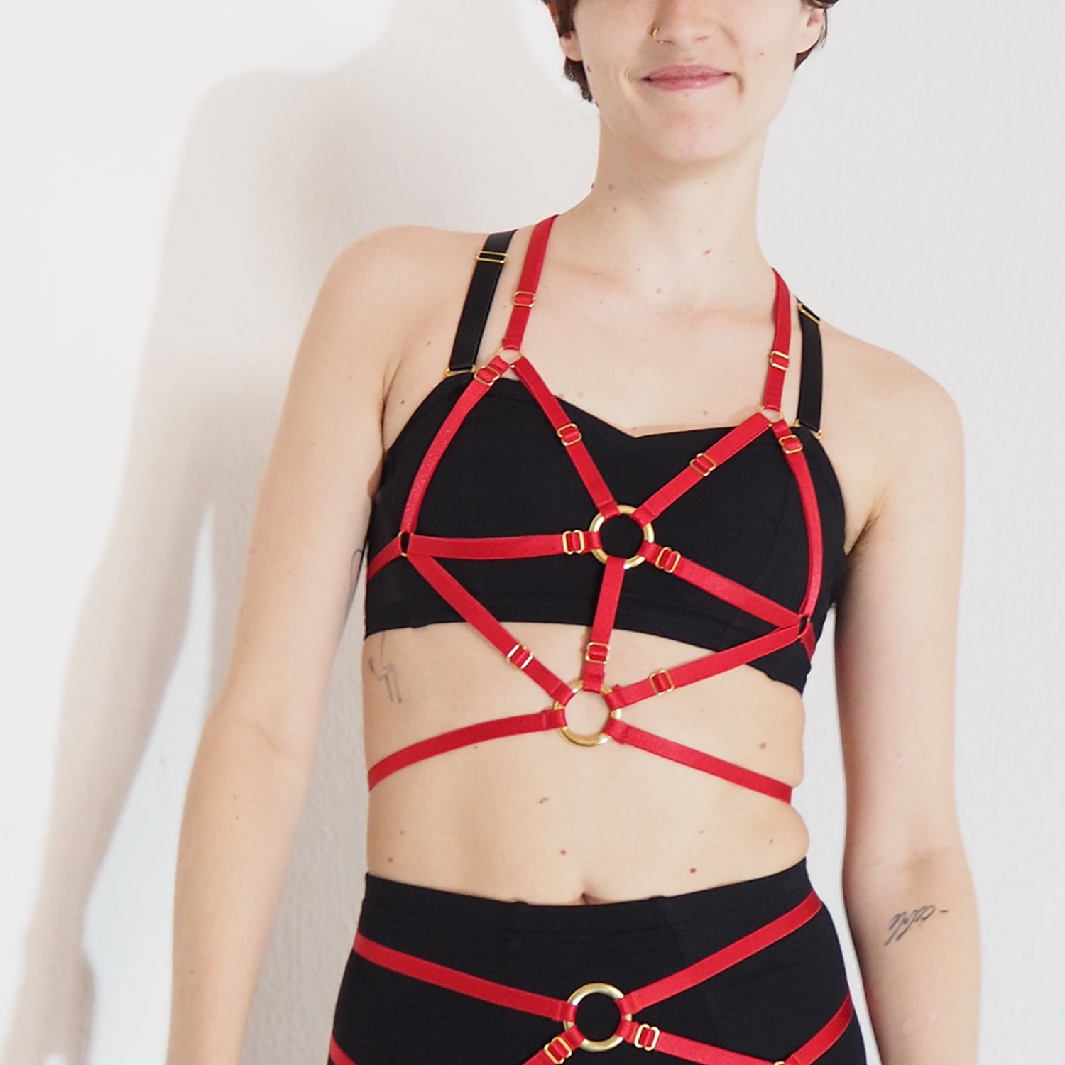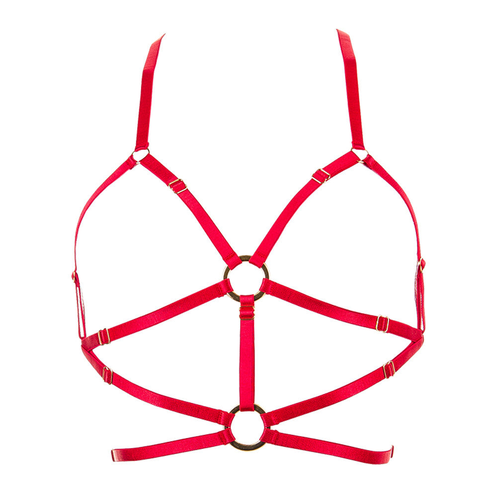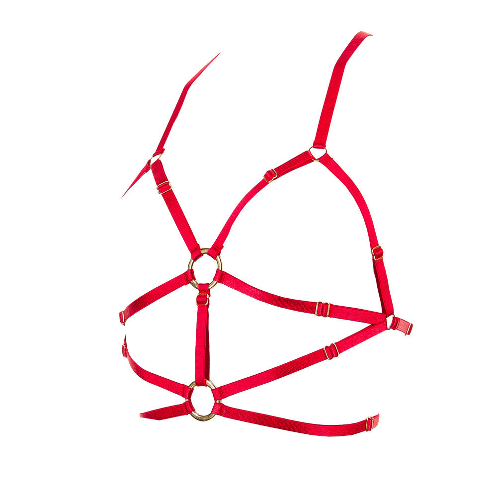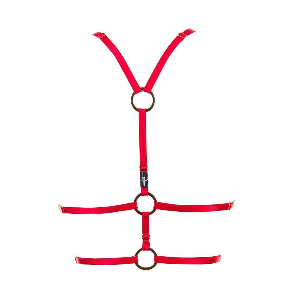 The Bon Bondage upper body harness Slim in red is the ultimate statement accessory and will make you feel incredibly sexy and confident. Every single 10m elastic is fully adjustable with nickel free gold plated rings and sliders, so the playsuit can be adjusted to suit all body types from sizes XS-XL.