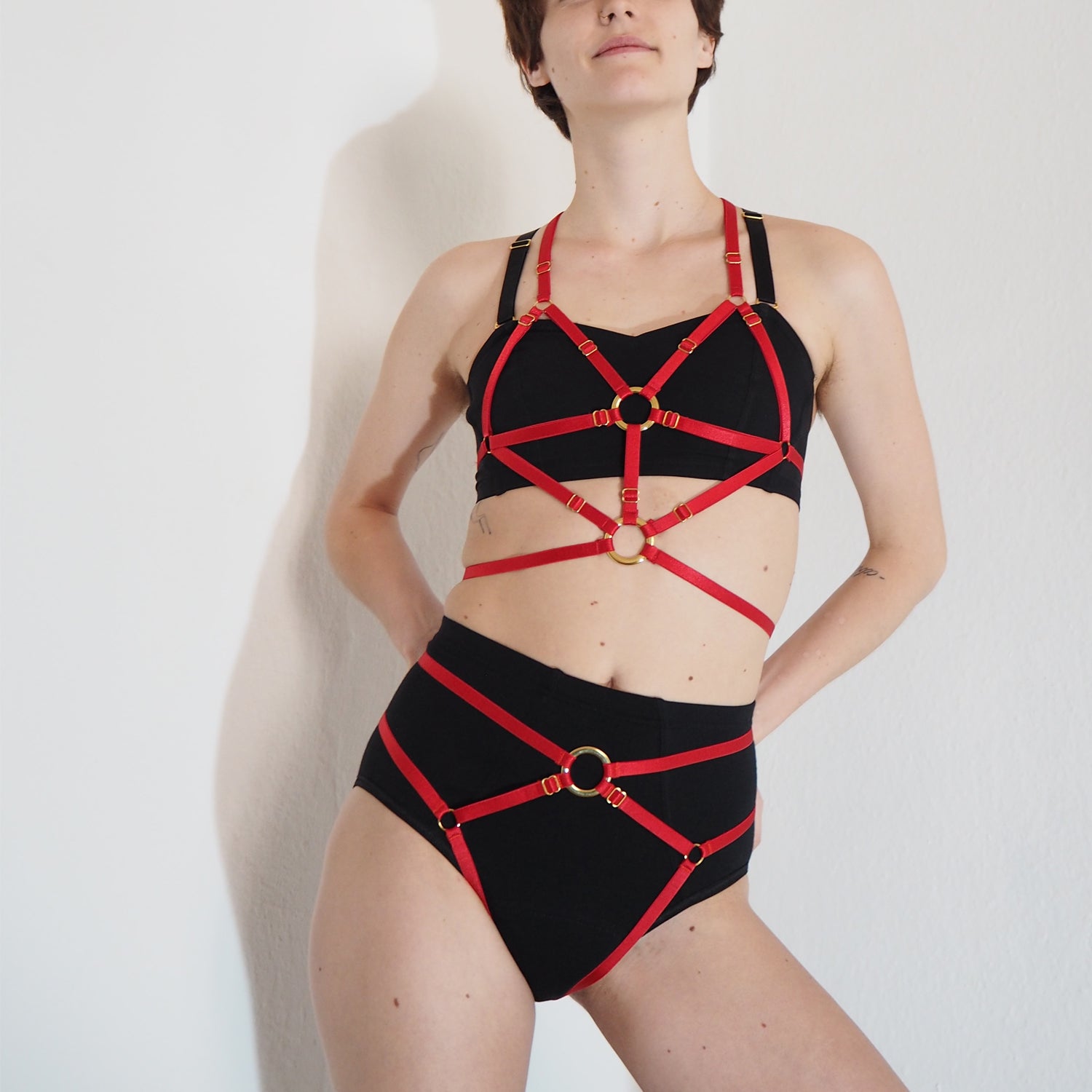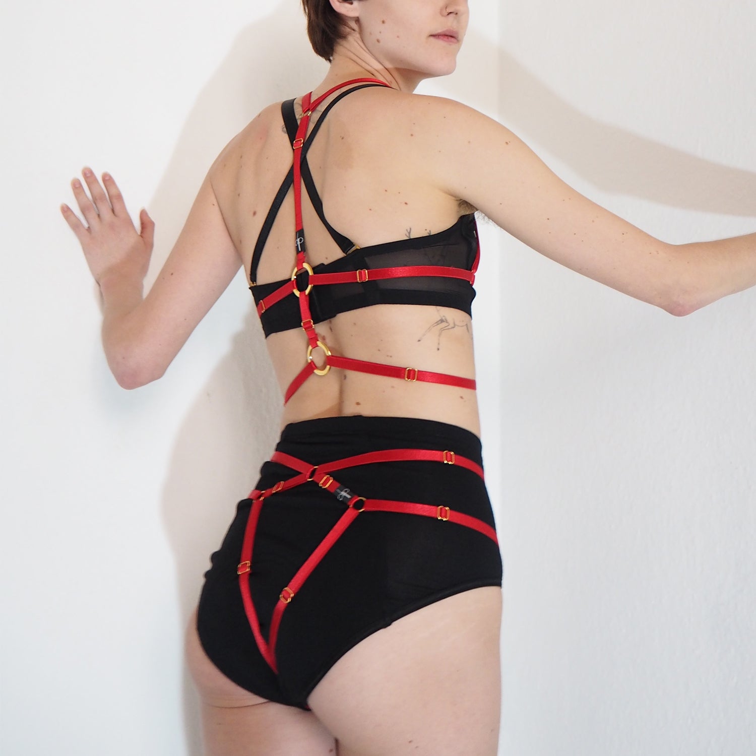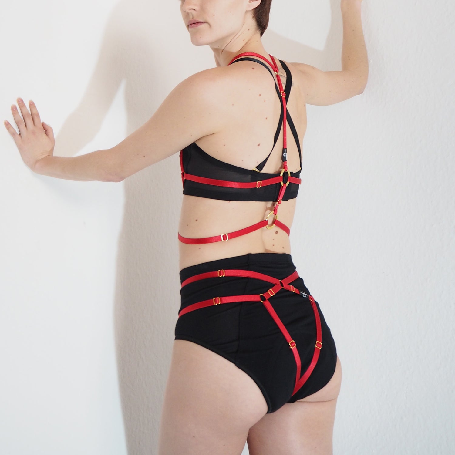 The Bon Bondage upper body harness Slim in red is the ultimate statement accessory and will make you feel incredibly sexy and confident. Every single 10m elastic is fully adjustable with nickel free gold plated rings and sliders, so the playsuit can be adjusted to suit all body types from sizes XS-XL.
