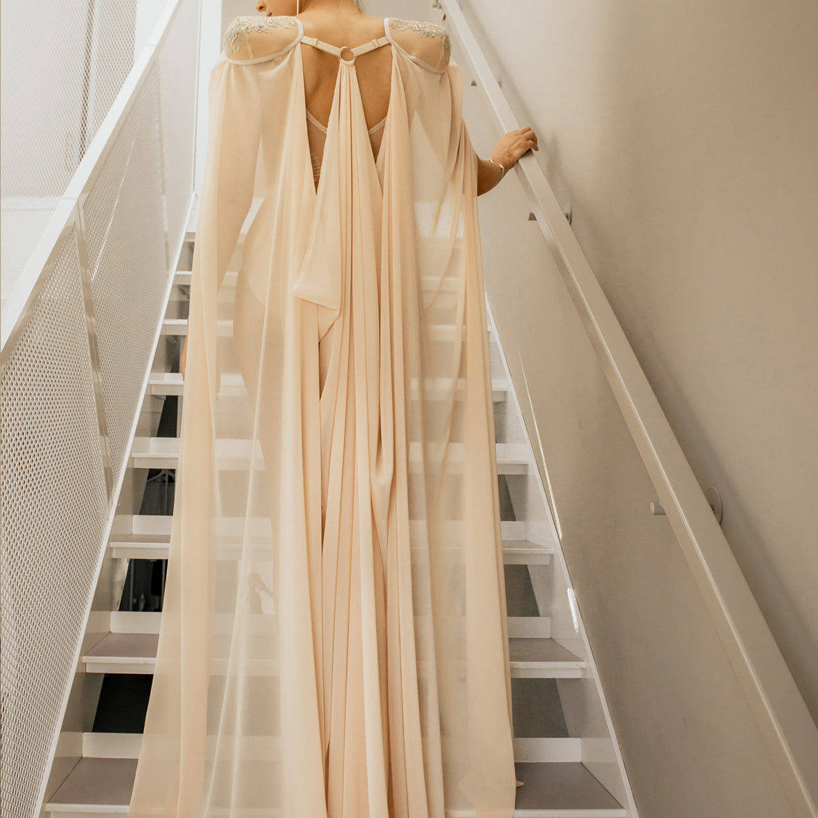 Super soft drapes swing gloriously over the body while taking modern boudoir elegance to a new level. The shoulder pads paneled with fine embroidered mesh give structure to the silhouette while the bondage inspired back detail offers a bit of playfulness. The fine powder colored chiffon is cascading to the floor and the floating never ends... perfect for when the postman rings.