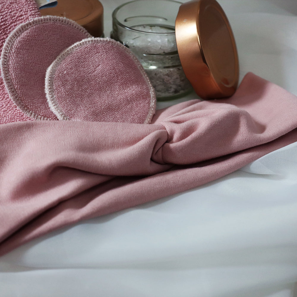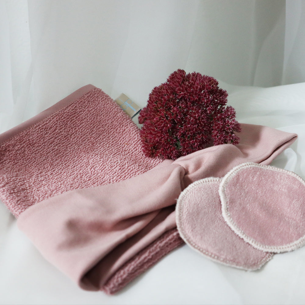 It includes a headband, three elastic scrunchies, seven washable make-up remover pads and a facecloth, all made of organic cotton in soft blush.
