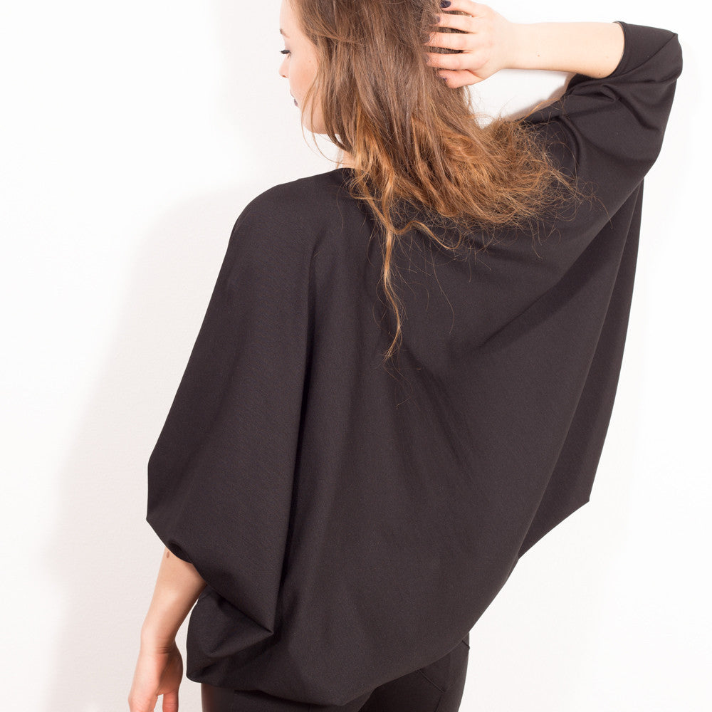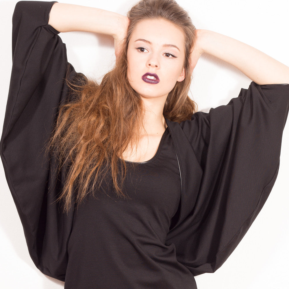Das schwungvolle Signature Cape mit Kunstleder Paspeln am Ausschnitt und Ärmelsaum ist super bequem und gleichzeitig so elegant. Und für alle Größen von XS-XL.