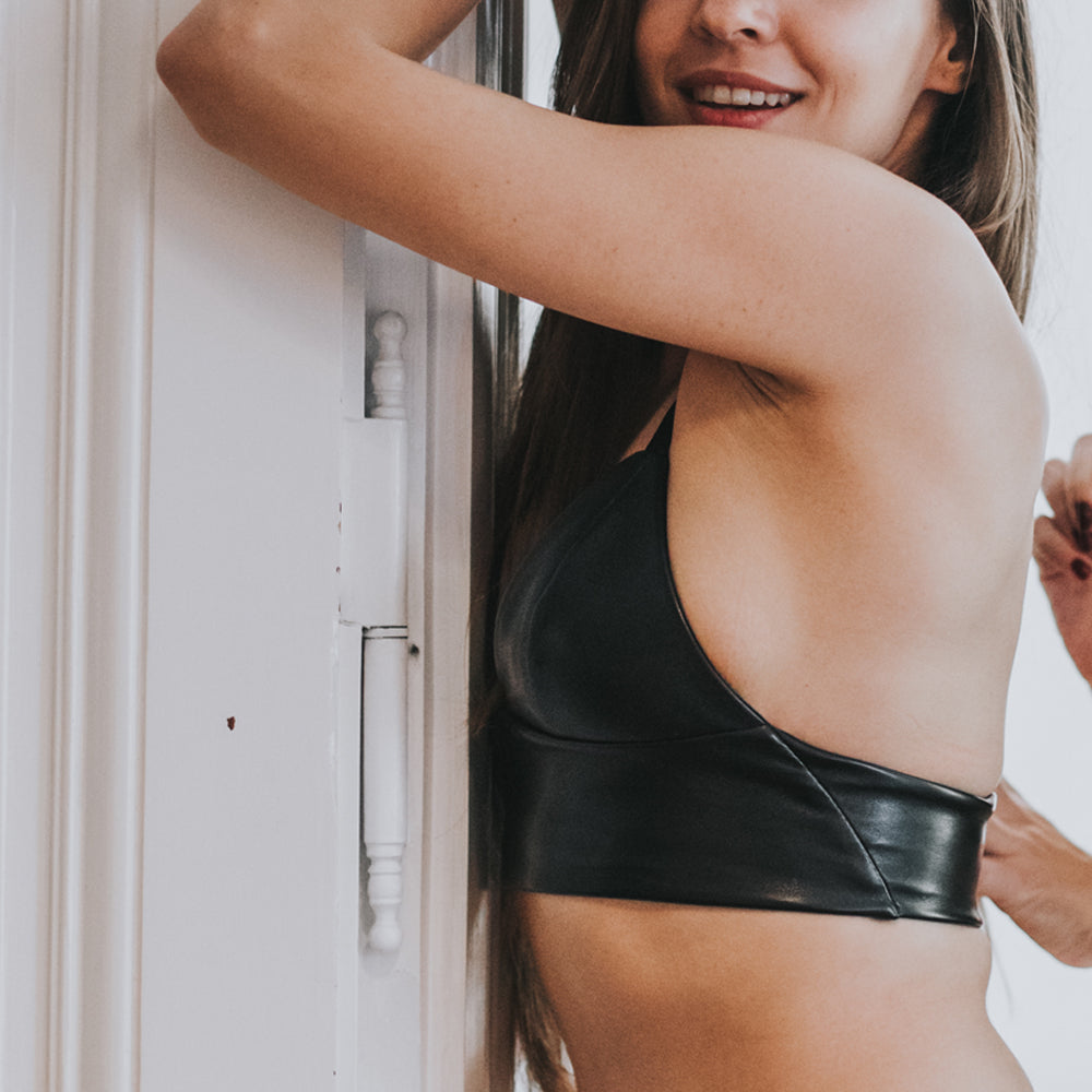 Die jüngere (noch hottere) kleine Schwester des Bon Bondage Bralettes ist da: das Bon Bondage Triangle Long Line Bralette, mit einem super weichen Futter aus Bio-Baumwolle und veganem Leder mit dem nötigen Touch Rock'n'roll an der Außenseite (ganz ohne sichtbare Nähte!) verzaubert mit einem besonders stylishen Träger als Rückendetail.